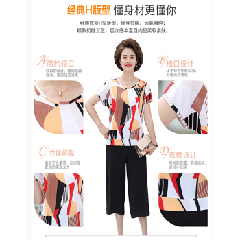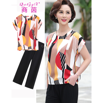 中老年女装>>商茵SY妈妈装套装中老年女装2020年夏款短袖上衣+阔腿裤中年40岁50洋气时尚百搭高贵气质两件套 红色方块套装 2XL(建议105-120斤)