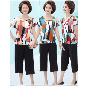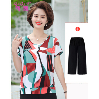 商茵SY妈妈装套装中老年女装2020年夏款短袖上衣+阔腿裤中年40岁50洋气时尚百搭高贵气质两件套 红色方块套装 2XL(建议105-120斤) |