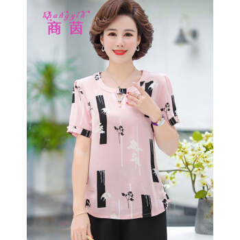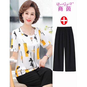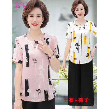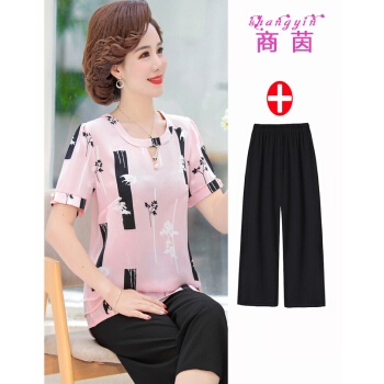 中老年女装>>商茵SY中老年女装妈妈装2020年新款夏装短袖衬衫减龄洋气雪纺衫中年人t恤中老年女装上衣+裤子套装 粉红色+阔腿裤 2XL【建议105-120斤】