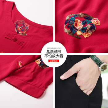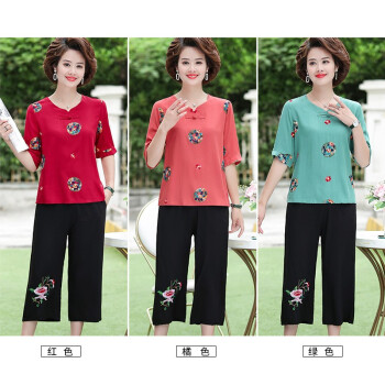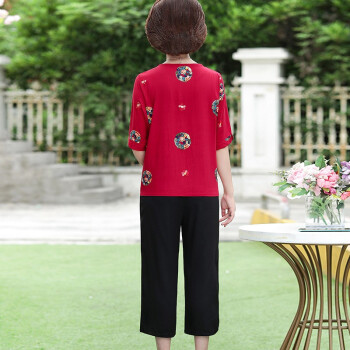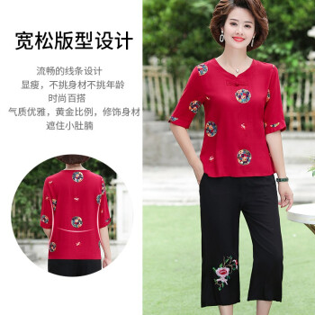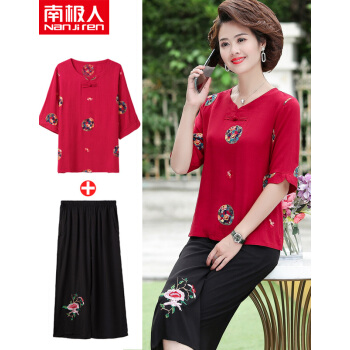 南极人 中老年女装2020夏季新款短袖妈妈套装洋气减龄棉麻两件套 红色套装 XXXL(建议体重120-135斤)