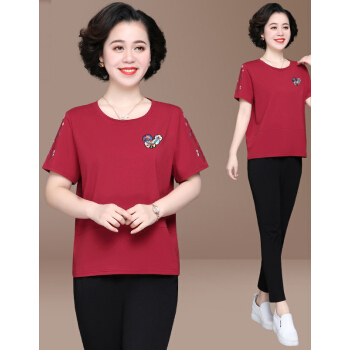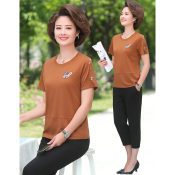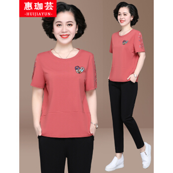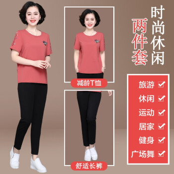 中老年女装>>惠珈芸中老年女装夏装两件套短袖T恤上衣洋气2020新款简约时尚减龄阔太太运动装女大码宽松妈妈装套装 皮红色(7分裤) 此码勿拍.请拍自身对应码数