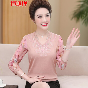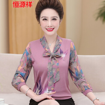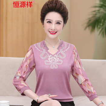 中老年女装>>恒源祥中老年女装妈妈装长袖t恤女士针织2020秋季新款中年大码圆领纱袖上衣九分袖老年人奶奶装打底衫 7220浅紫 xL建议110--125斤