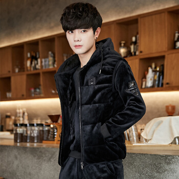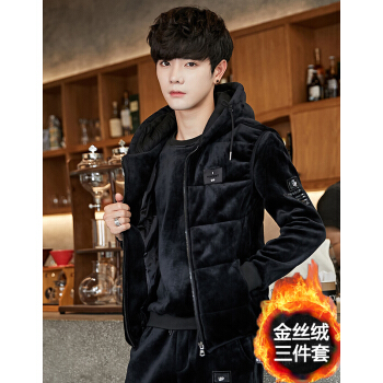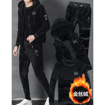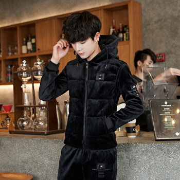 其他衣服>>潮人卫衣男潮流衣服冬装情侣卫衣冬季金丝绒加绒加厚卫衣套装男韩版男生三件套男装 黑色 XL