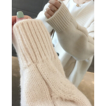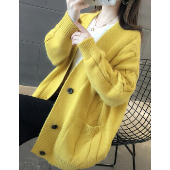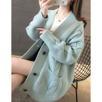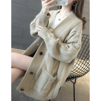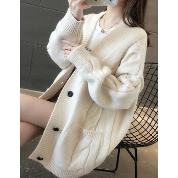 婪澈长袖针织衫女2020春秋新款女装韩版慵懒风V领中长款麻花针织衫宽松女开衫百搭毛衣外套 米白色 L