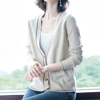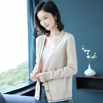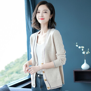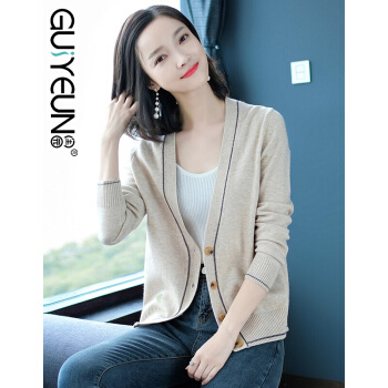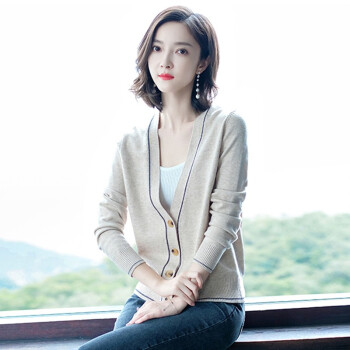 闺园针织衫女短款2020秋冬季新款V领针织开衫毛衣女外套薄款休闲打底上衣女 灰燕麦 请拍正确尺码