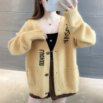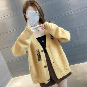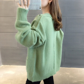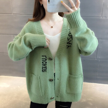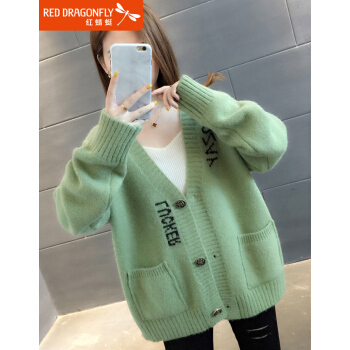 针织衫>>红蜻蜓 针织衫女2020秋装新款韩版V领字母口袋提花针织外套上衣宽松毛衣女开衫 WL727-2 绿色 均码