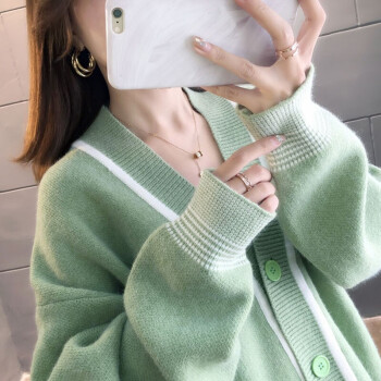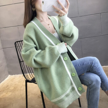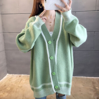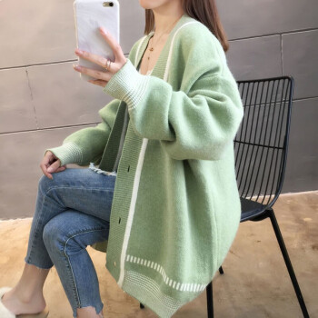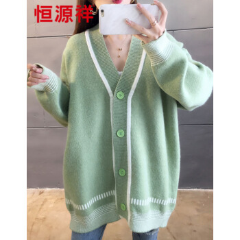恒源祥针织衫女2020秋季新品韩版中长款开衫外套女针织衫潮宽松慵懒风时尚百搭V领上衣女111 绿色 M