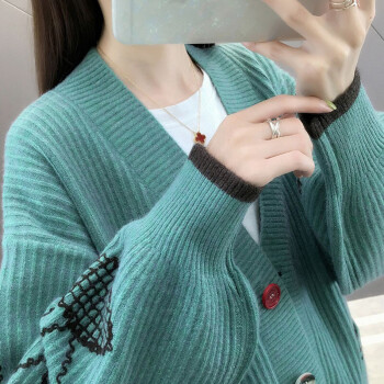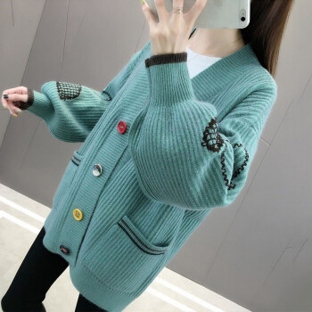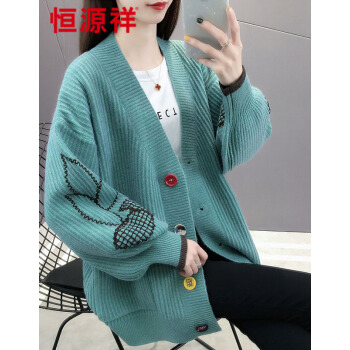 针织衫>>恒源祥针织衫女2020秋季新品时尚慵懒风外搭开衫女灯笼袖刺绣针织衫女韩版宽松毛衣外套女0215 湖蓝 请拍正确尺码