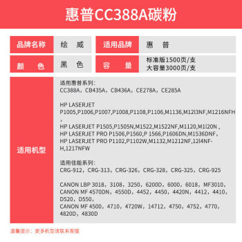 硒鼓/粉盒>>绘威CC388A 88A碳粉6支装 适用惠普HP P1007 P1106 P1108 M126a M128fp M1136 M1216nfh打印机硒鼓 墨粉