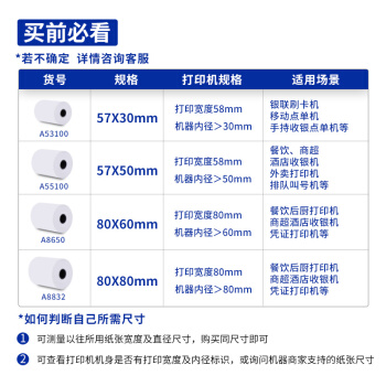 科密 热敏小票纸 80x60mm 美团外卖小票打印纸 超市餐饮收银机收银纸 30米/卷 50卷/箱 A8650 |