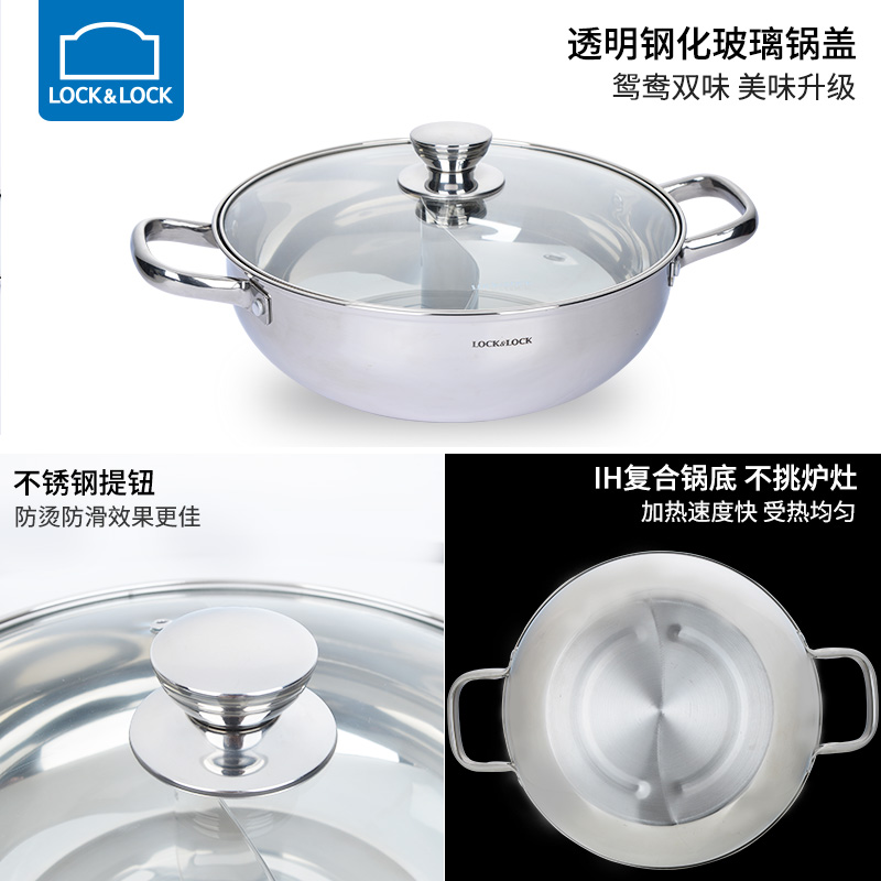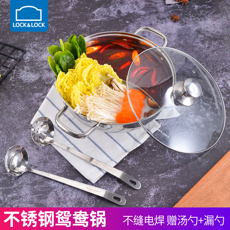 不锈钢加厚电磁炉燃气通用(配汤勺漏勺)鸳鸯火锅 28cm【不锈钢/不锈钢色】