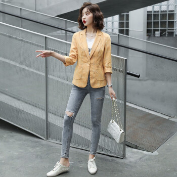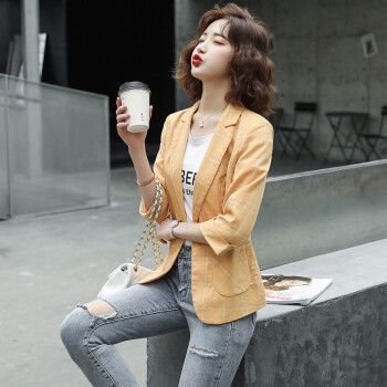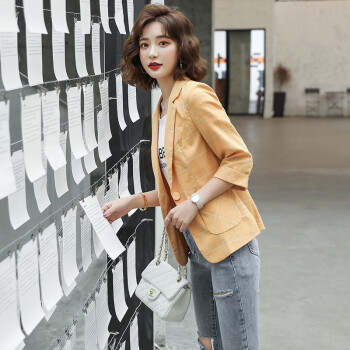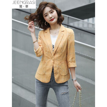 小西装>>简草 小西装女2020秋装新款韩版时尚通勤简约气质百搭潮流格纹一粒扣七分袖西服外套女X8988 黄色 XL