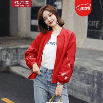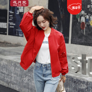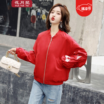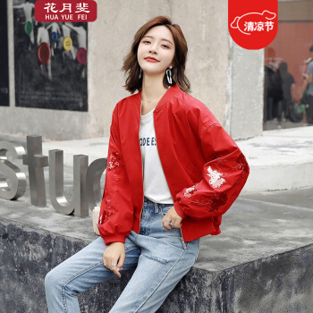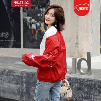 花月斐刺绣短外套女2020新款韩版宽松亮片棒球衫简约显瘦女士外套1992 红色 L