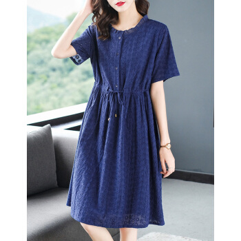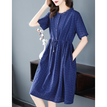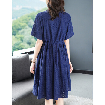 大码女装>>木棉林高端透气大码女装2020新款夏装胖妹妹mm洋气镂空中长款遮肚显瘦蕾丝连衣裙子H202563 宝蓝色 3XL建议160-180斤