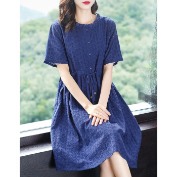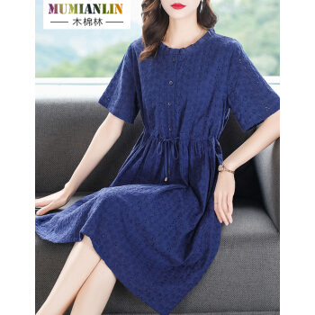 木棉林高端透气大码女装2020新款夏装胖妹妹mm洋气镂空中长款遮肚显瘦蕾丝连衣裙子H202563 宝蓝色 3XL建议160-180斤 |