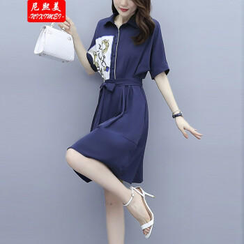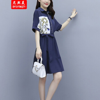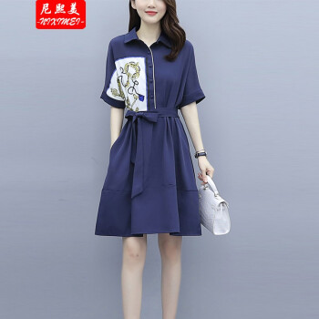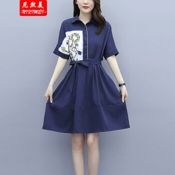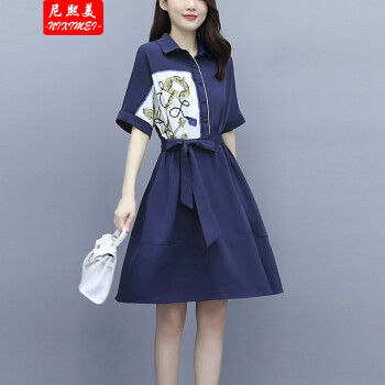 尼熙美 大码女装胖mm2020夏装新款气质胖妹妹宽松显瘦遮肚子加肥加大时尚拼接衬衫遮肉连衣裙 蓝色 2XL 建议135-150斤