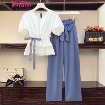 婷慕莎加肥加大码女装显瘦遮肚套装胖妹妹夏装胖女人显瘦款微胖mm200斤时尚洋气胖子女装阔腿裤两件套 套装 大码XXXL