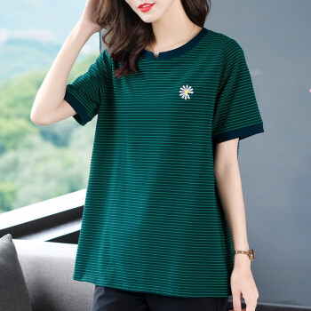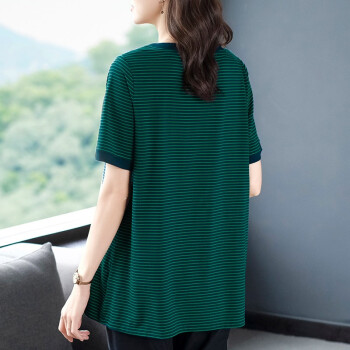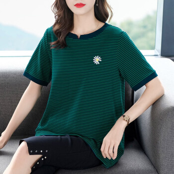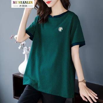 大码女装>>木棉林胖妹妹mm宽松t恤女韩版加大码女装2020新款夏装200斤显瘦条纹中长款洋气上衣L202733 蓝底绿条 3XL建议160-180斤