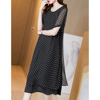 莎妮朵罗大码女装雪纺连衣裙2020夏装新品气质优雅圆点宽松短袖长裙16174 黑色 4XL建议160-180斤穿着