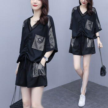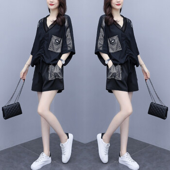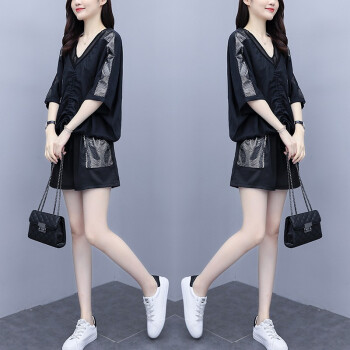 芷依丽 时尚大码胖MM套装女2020夏季新款宽松短袖上衣女T恤休闲阔腿短裤运动两件套 黑色 L