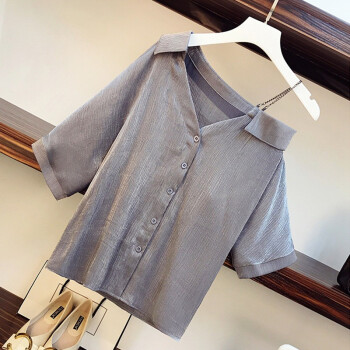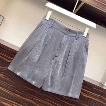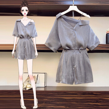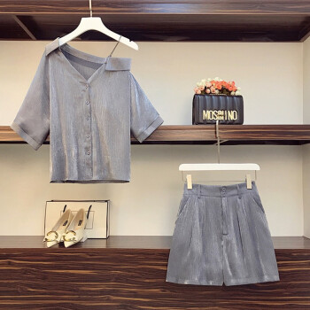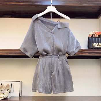 香爱蜜 时尚大码套装女2020夏装新款气质宽松衬衫女短袖T恤洋气减龄胖妹妹阔腿短裤梨形两件套装 银灰色 L建议90-105斤