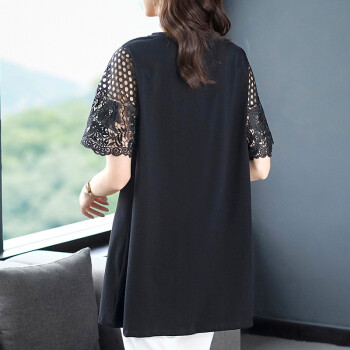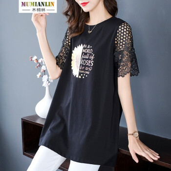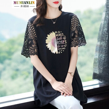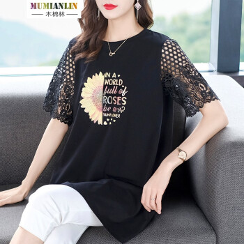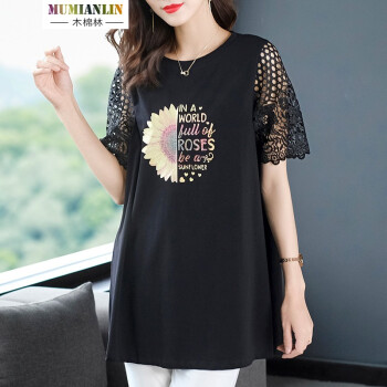 木棉林高端大码女装2020新款夏装胖妹妹mm减龄镂空拼接洋气印花中长款宽松显瘦T恤女L202797 黑色 2XL建议140-160斤