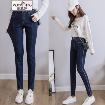 大码女装>>澳雅婷大码牛仔裤女胖mm200斤胖妹妹秋装2020年新款弹力显瘦修身高腰小脚长裤子9019 深蓝色 4XL 建议您170-190斤