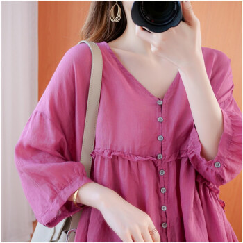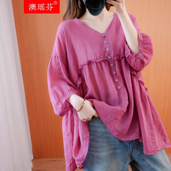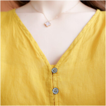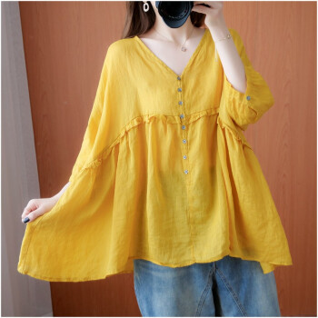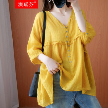 澳瑶芬 胖妹妹夏装棉麻休闲上衣大码女装胖mm纯色遮肚子显瘦加肥加大码胖人女装百搭衬衫 黄色 大码均码 (建议110-220斤)