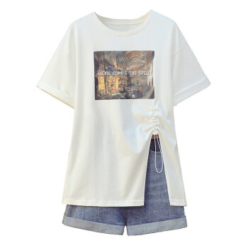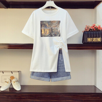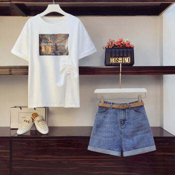 可馨怡 加肥加大码女装胖mm新款胖妹妹夏装200斤洋气遮肚子显瘦t恤牛仔短裤时尚两件套装 套装 XXXL(建议150-175斤左右)