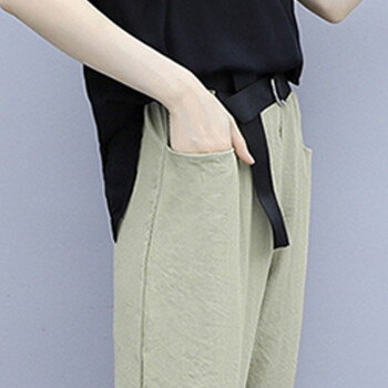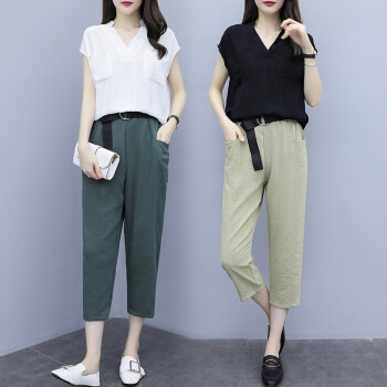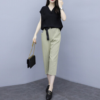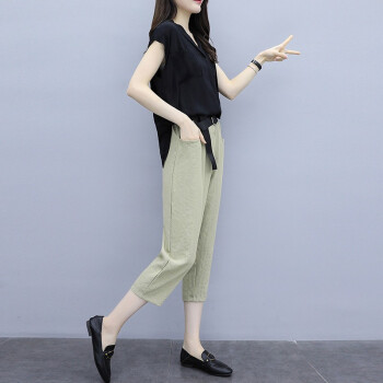 法萝迪 大码女装夏季新款棉麻女装遮肚子200斤胖妹妹加肥加大高腰阔腿裤套装 黑+卡 3XL