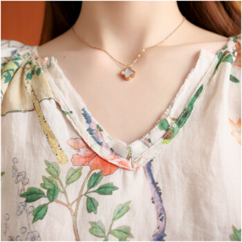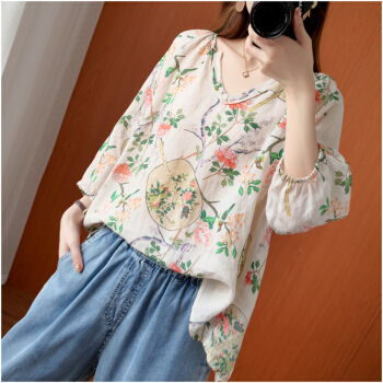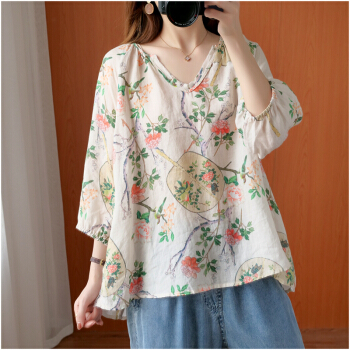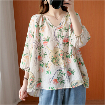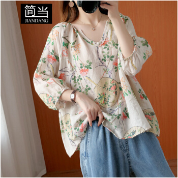 简当2020新款夏装加大码女装胖妹妹MM棉麻短袖宽松上衣单件上衣衬衫防晒衣T恤ZRK3061 花色 大码均码
