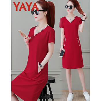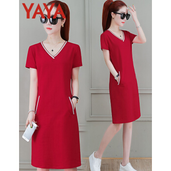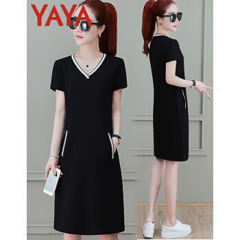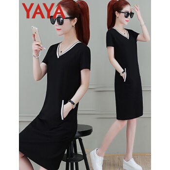 连衣裙>>鸭鸭服饰(yaya)休闲运动连衣裙女中长款2020夏季新款宽松显瘦短袖V领T恤衬衫裙时尚女装裙子女 黑色 请选择正确尺码