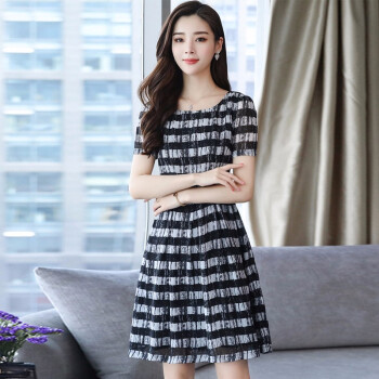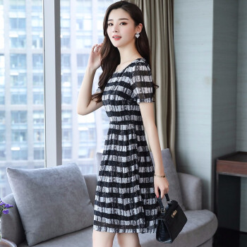 凝拉雪纺连衣裙女2020夏季流行新款时尚大码条纹衬衫裙短袖夏天气质裙子 格子 2XL(建议135-150斤) |