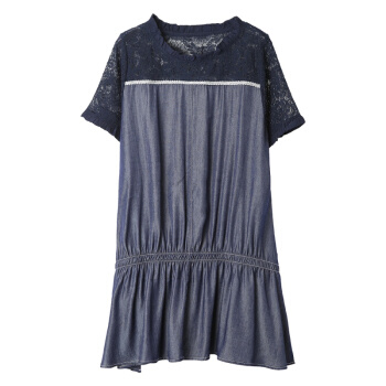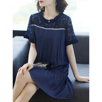 红粉宣言2020夏季新款百搭宽松蕾丝连衣裙显瘦短袖拼接裙子 蓝色 L