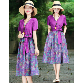 苏洛琳雪纺连衣裙女2020夏季新款大码女装时尚气质女士棉麻中长印小个子碎花连衣裙蕾丝裙子女 图片色 M |