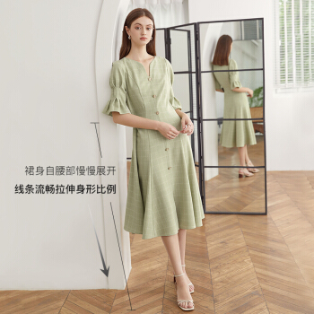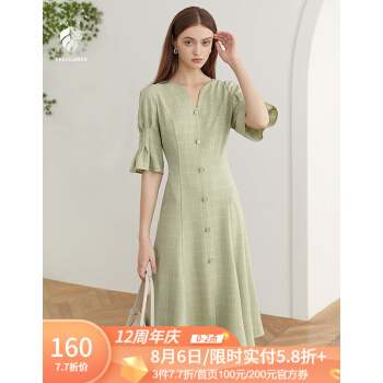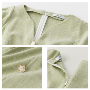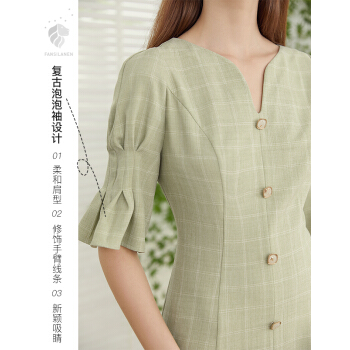 范思蓝恩 2020夏新款泡泡袖V领格子连衣裙女天法式复古约会小裙子 绿白格 S |