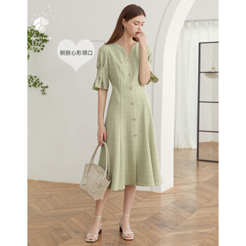 连衣裙>>范思蓝恩 2020夏新款泡泡袖V领格子连衣裙女天法式复古约会小裙子 绿白格 S