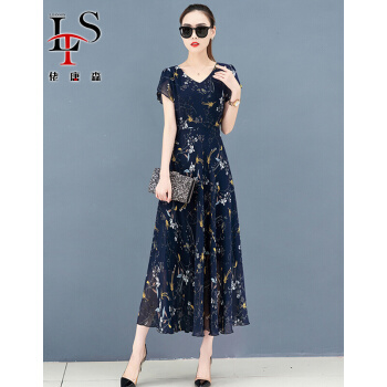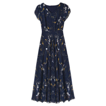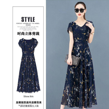 佬唐森印花雪纺连衣裙2020夏季新款碎花长裙大码女装遮肉显瘦减龄裙子 蓝底水仙花 请拍正确尺码