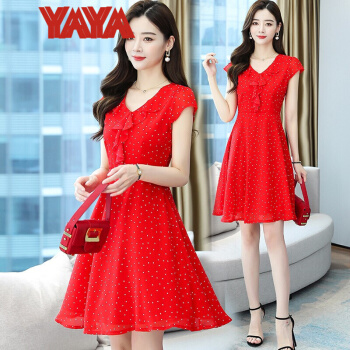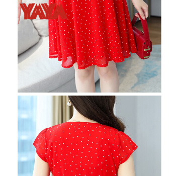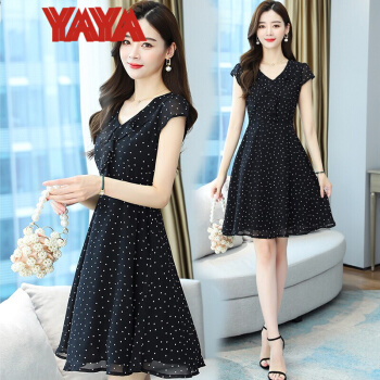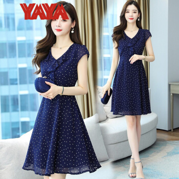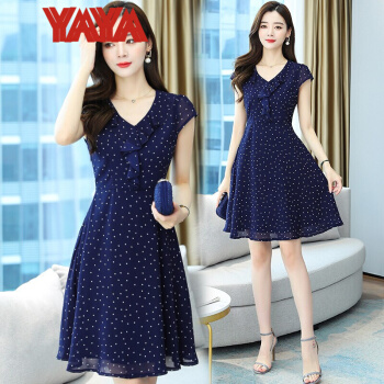 鸭鸭服饰(yaya)波点雪纺连衣裙女2020年女装夏季新款v领短袖荷叶边气质裙子女夏 蓝色 请选择正确尺码