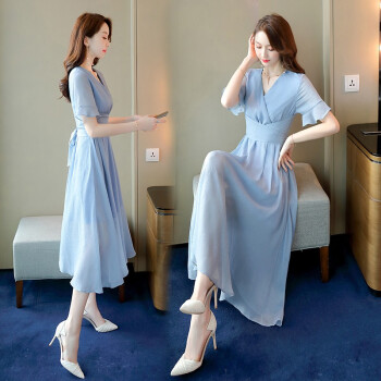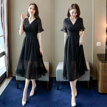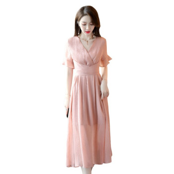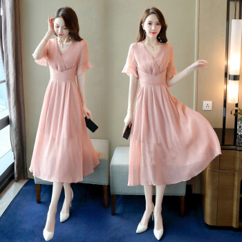 信和祥雪纺连衣裙女2020夏季流行新款简约V领通勤荷叶袖中长款纯色短袖夏天气质裙子 粉色 L