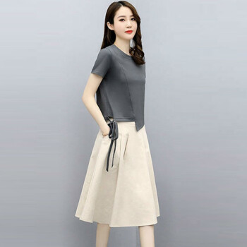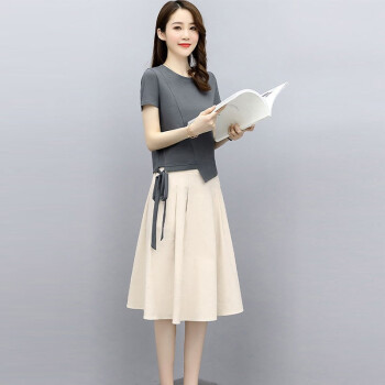 莱倪晟纳连衣裙2020年新品女装夏季短袖时尚洋气宽松两件套中长款裙子 灰色上衣+米白裙子 请拍正确尺码 |